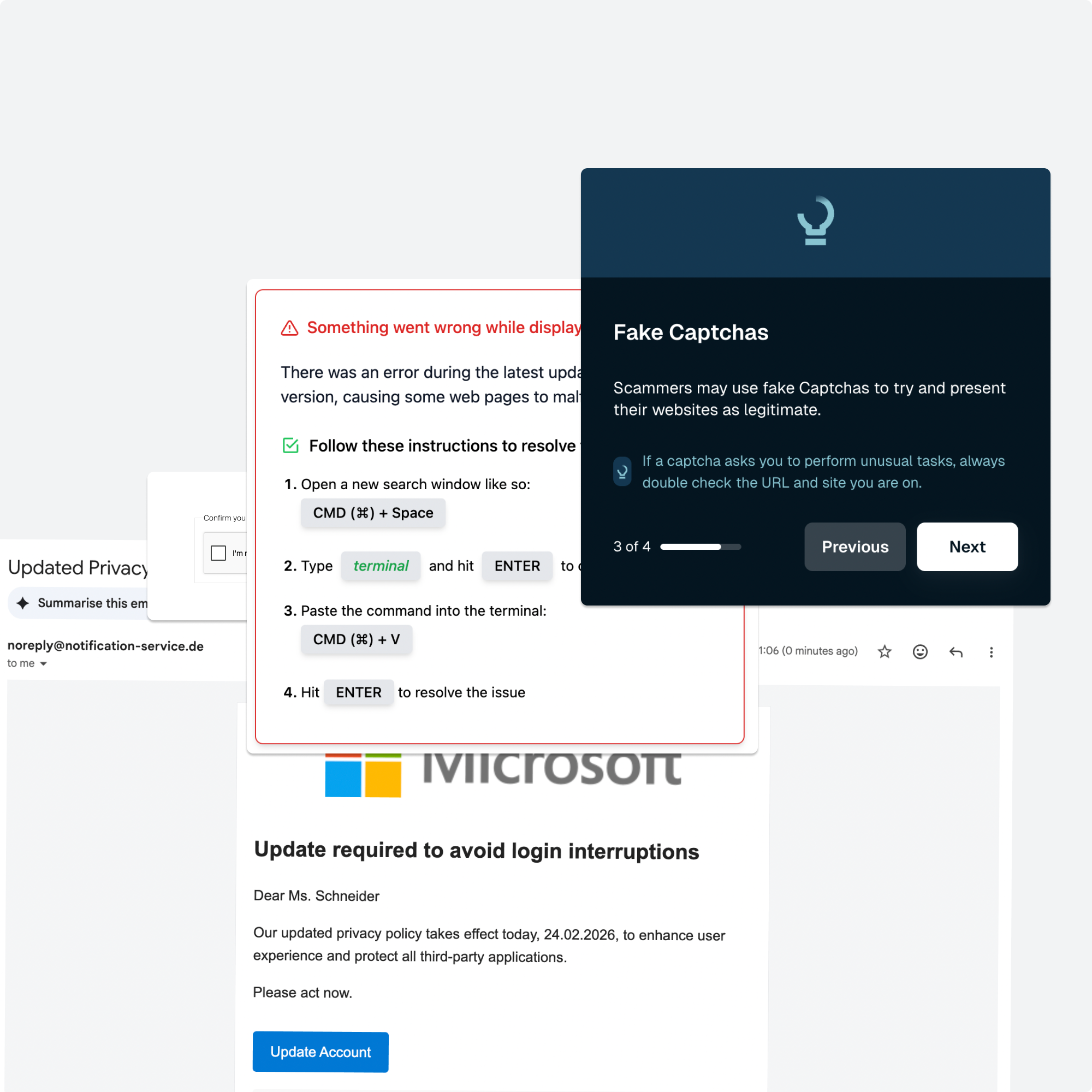 First comes emotional pressure: a copyright claim or account-suspension warning pushes people toward quick action. Impersonating a major platform (Facebook/Meta) leverages strong recognition and the expectation of legitimate, familiar login flows. A fake CAPTCHA lowers suspicion, since users are accustomed to clicking “I’m not a robot” to continue.