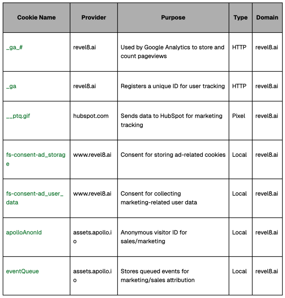 We use marketing tools such as HubSpot and Apollo.io that may set cookies when you interact with our marketing content. For example, when you visit landing pages or open marketing emails. These cookies can collect personal information like your name, browsing behavior on our website, how you arrived here, or interactions with our campaigns. This data helps us evaluate the effectiveness of our marketing efforts and improve the relevance of our communications.Occasionally, third-party cookies also appear in this category. While we strive to monitor and manage them, revel8 GmbH does not always have full control over those cookies and does not share personal data with those third parties.